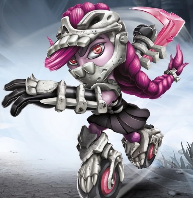 Roller Brawl grew up with five older vampire brothers, who were all very big and overprotective. Being the smallest of her family, she learned how to use her speed and cunning to become one of the toughest jammers in the Undead Roller Derby League. It was during the championship match when she caught the eye of Kaos, who fell head-over-heels in love with her. But when her overprotective brothers stepped in, Kaos had them captured by Drow and taken prisoner. Roller Brawl swore revenge, but even with her impressive skills, she was no match for an entire Drow army. Having developed a strong distaste for evil, she joined up with the Skylanders to fight against Kaos - while never giving up on her search for her brothers.